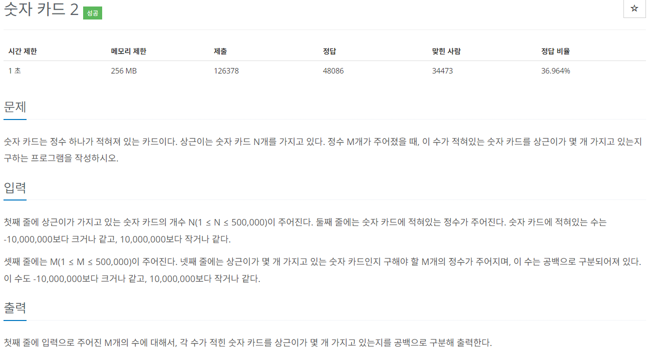 첫째 줄에 상근이가 가지고 있는 숫자 카드의 개수 N(1 ≤ N ≤ 500,000)이 주어진다. 둘째 줄에는 숫자 카드에 적혀있는 정수가 주어진다. 숫자 카드에 적혀있는 수는 -10,000,000보다 크거나 같고, 10,0