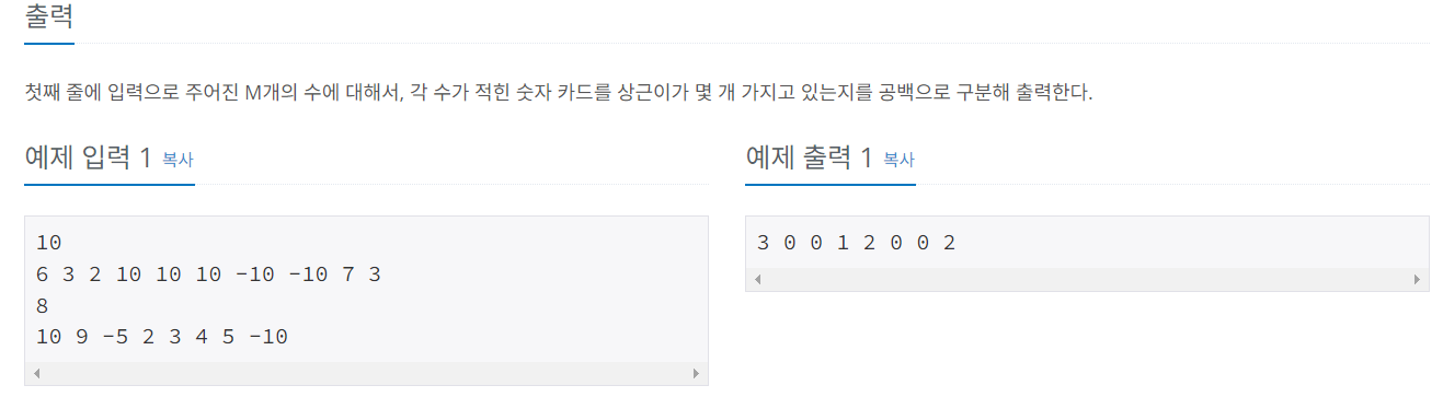 순서대로 그냥 입력받는게 아니라 상근이 카드의 정수값을 맵의 key값으로 넣어주고