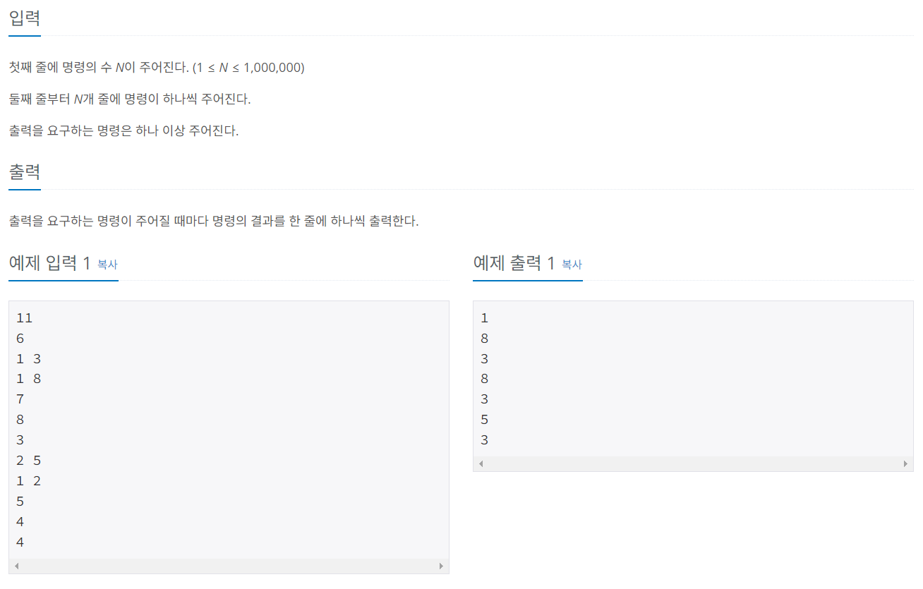 첫째 줄에 명령의 수 N이 주어진다. (1 ≤ N ≤ 1,000,000) 둘째 줄부터 N개 줄에 명령이 하나씩 주어진다. 출력을 요구하는 명령은 하나 이상 주어진다.