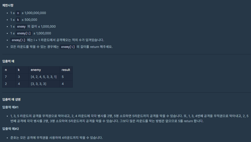 처음에는 enemy[i]의 합이 n보다 작으면 병사를 소모하고