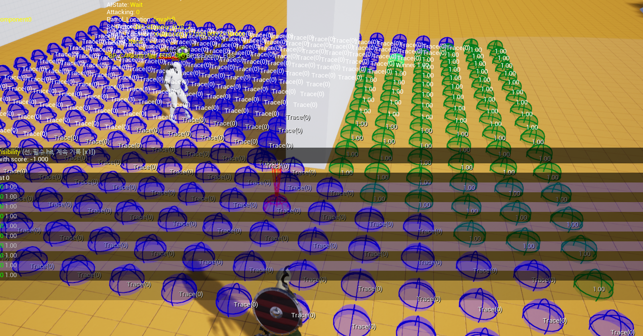 Querier(현재 AI)와의 거리가 500 이상인 지점은 필터링되어 파란색으로 되어있다