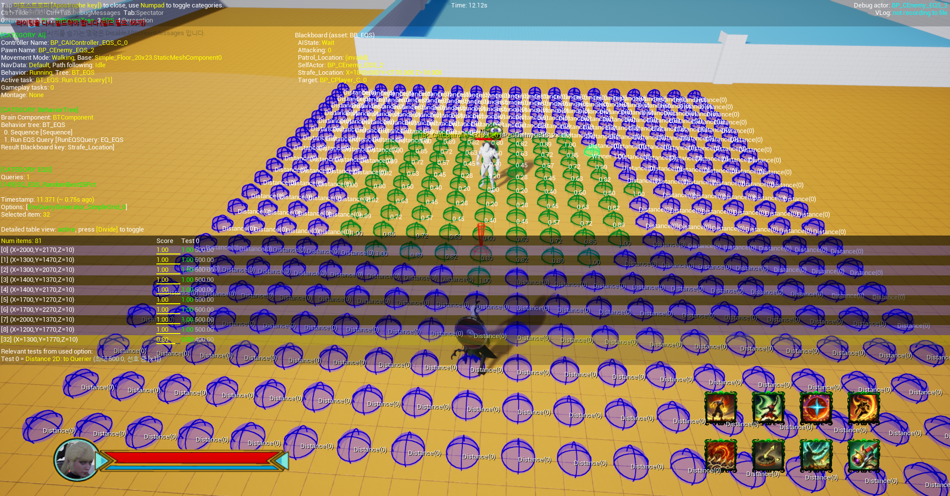 EQS가 잘 돌아가고 있는지 디버깅 하려면 실행 후 플레이어에 빙의한 뒤 ' (단따옴표) 키를 눌러 디버깅 모드로 들어가고