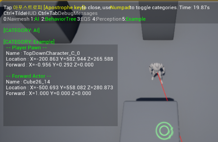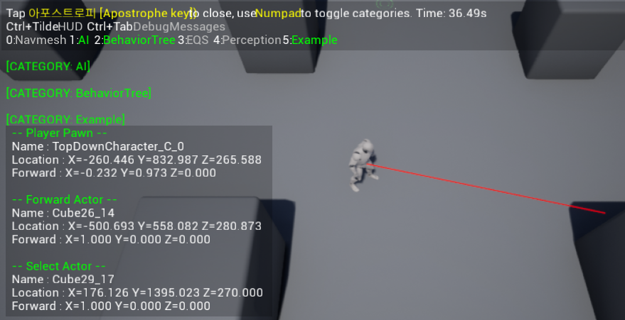 플레이어의 위치, 라인트레이스해서 히트된 액터, 디버깅할 액터 등의 정보를 출력해보았다