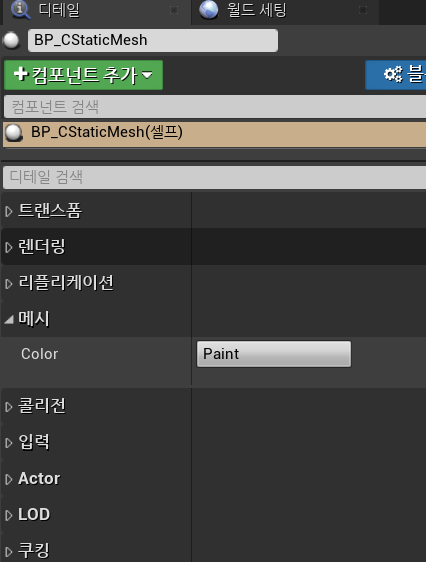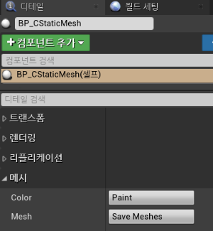 mesh.AddCustomRow(FText::FromString("FindColor")) //카테고리에 한 줄 추가, text는 검색할때 찾을 검색어
