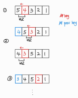 두 번째 원소부터 그 앞의 원소들과 차례로 비교해가며 위치를 옮겨가는 정렬이다.